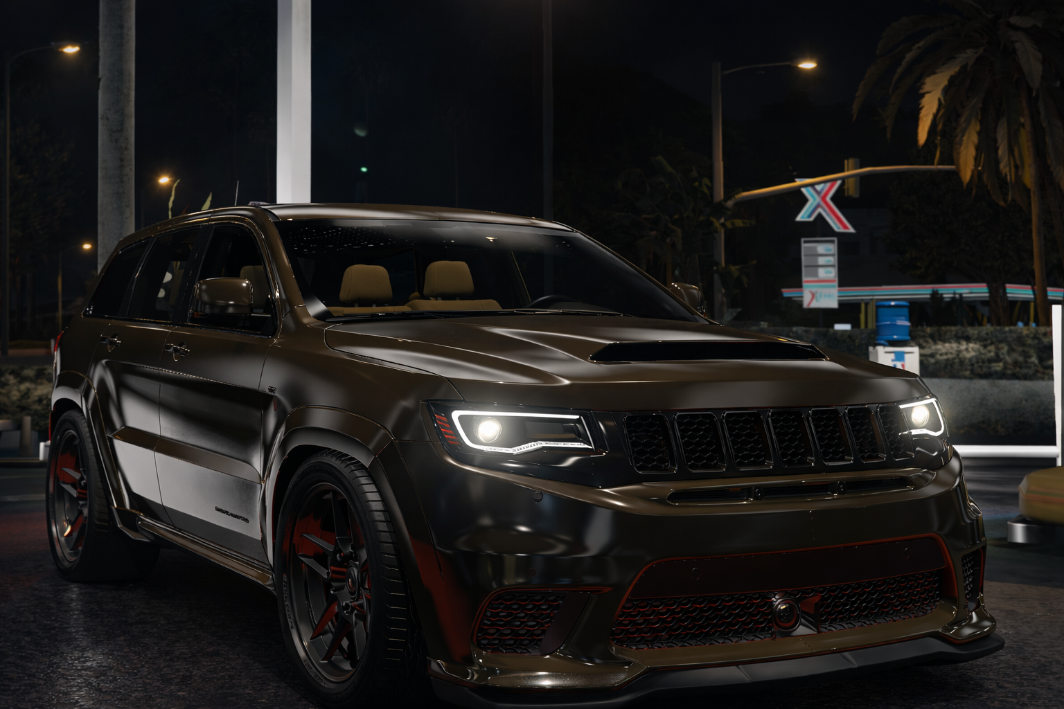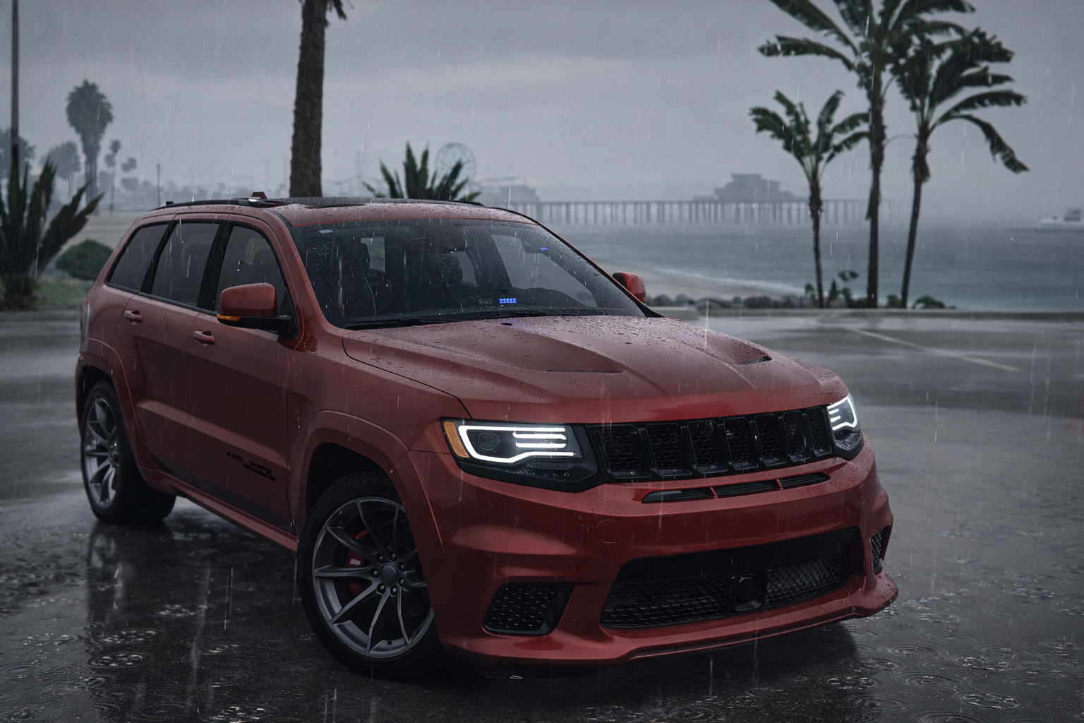 جراند شيروكي تراك هوك — SUV عضلية تجمع بين القوة والهيبة والتصميم الهجومي العريض، حضورها على الطريق ما ينفعش يتجاهله أحد.